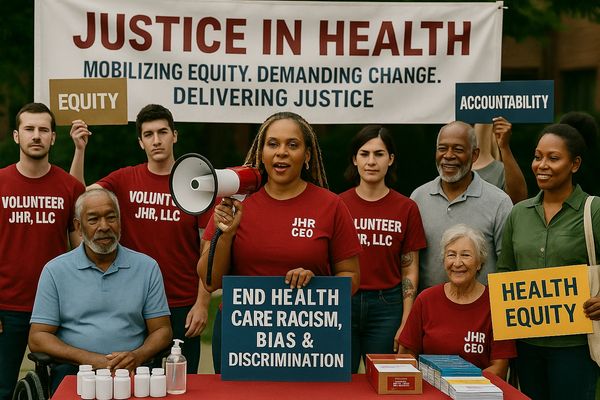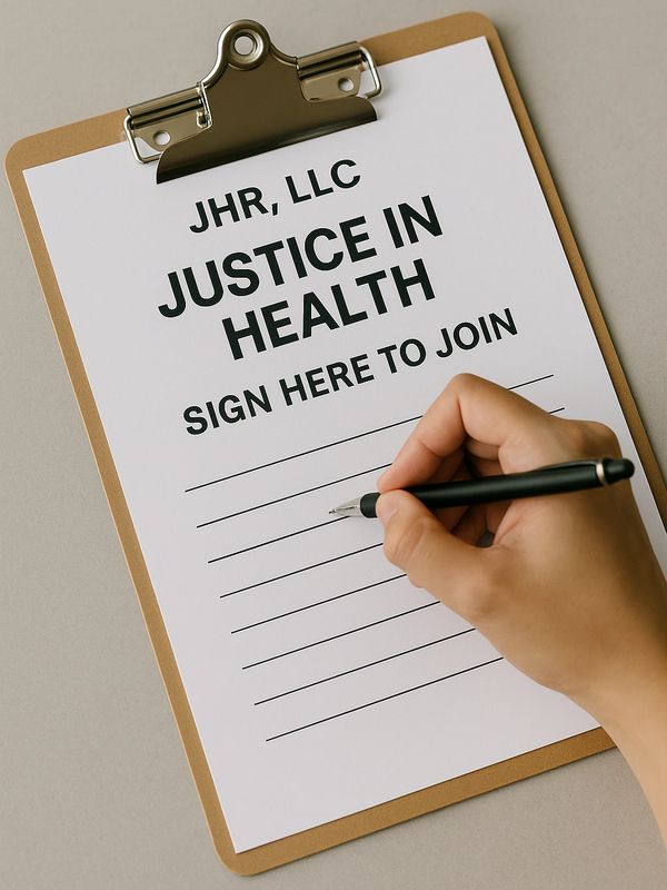 The Justice in Health program is the cornerstone initiative of Just Health Restoration, LLC — where lived experience meets strategic action. This multifaceted program confronts systemic healthcare injustices through grassroots power-building, community education, and transformative policy change.